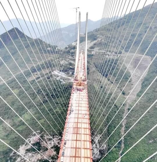 “鋼絞線拉索施工的化整為零施工方法,可以單根鋼絞線運輸,一兩噸的小貨車也可以拉運,到現(xiàn)場再組裝、掛索,吊裝可以用小型的設(shè)備,施工張拉可以采用重量很輕的小型張拉設(shè)備。”李文獻(xiàn)說,這就很好地解決了運輸、起吊方面的難題,施工也比平行鋼絲拉索便利很多,非常契合世界第一高橋的施工工況。