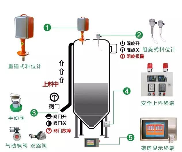 上料口側(cè):安全上料控制終端、上料安全閥,每個(gè)料倉(cāng)各1個(gè),各個(gè)終端通過網(wǎng)絡(luò)連接。