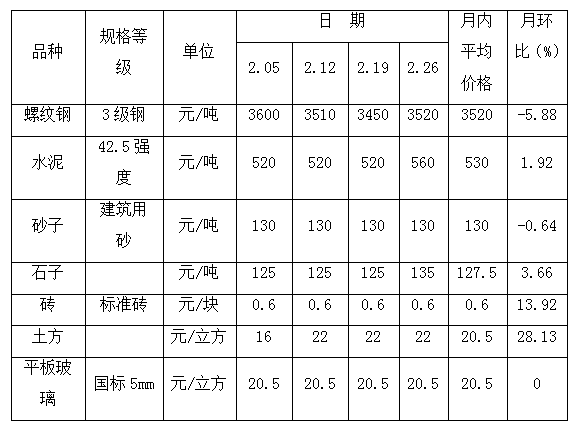 受春節(jié)假期和新冠肺炎疫情影響,2月份山東省濟(jì)寧市黃河灘區(qū)遷建物資市場交易量明顯減少,價格變動整體漲跌互現(xiàn)。與上月相比,7種黃河灘遷建物資價格呈4升2降1平態(tài)勢。其中,螺紋鋼的價格震蕩下行,水泥的價格穩(wěn)中有漲,砂子、磚和平板玻璃的價格月內(nèi)平穩(wěn)運(yùn)行,石子的價格受季節(jié)性供應(yīng)減少影響小幅上升,土方的價格呈現(xiàn)高位整理態(tài)勢。螺紋鋼方面,截止到2月26日,濟(jì)寧市梁山縣監(jiān)測的螺紋鋼市場批發(fā)價格為3520元/噸,價格下降明顯。由于目前特殊時期,貨運(yùn)受阻且下游企業(yè)復(fù)工進(jìn)度開展緩慢,短期內(nèi)需求仍然偏弱,市場整體成交冷清,庫存和資金壓力逐步增加,供給壓力放大,商家對于后市心態(tài)偏空,處于悲觀情緒,市場整體處于有價無市狀態(tài)。