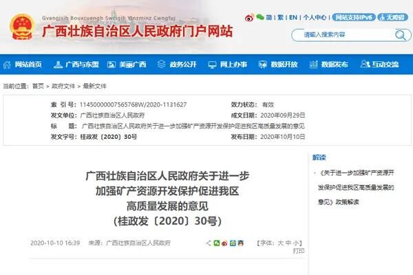 近日,廣西壯族自治區(qū)人民政府發(fā)布《關(guān)于進一步加強礦產(chǎn)資源開發(fā)保護促進我區(qū)高質(zhì)量發(fā)展的意見》,針對自治區(qū)礦業(yè)開發(fā)布局不合理、規(guī)模化水平不高、粗放利用和生態(tài)環(huán)境保護不到位等問題提出若干建議,努力加強礦產(chǎn)資源開發(fā)保護,提高礦產(chǎn)資源有序開發(fā)和綜合利用水平。