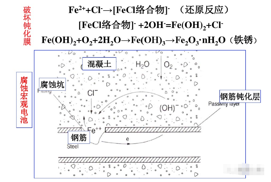 沿海地區(qū)主要的腐蝕因素就是硫酸鹽、氯離子、鎂離子等,對(duì)有堿活性骨料,還要考慮加鉀離子和鈉離子。其中,讓大家最關(guān)注的就是氯離子對(duì)鋼筋的銹蝕作用。
