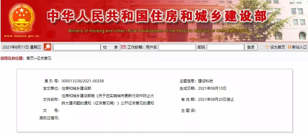 為深入貫徹黨的十九屆五中全會(huì)精神和“十四五”規(guī)劃綱要部署要求,指導(dǎo)各地積極穩(wěn)妥實(shí)施城市更新行動(dòng),防止沿用過(guò)度房地產(chǎn)化的開(kāi)發(fā)建設(shè)方式,大拆大建,急功近利等問(wèn)題,我部研究起草了《關(guān)于在實(shí)施城市更新行動(dòng)中防止大拆大建問(wèn)題的通知》,現(xiàn)向社會(huì)公開(kāi)征求意見(jiàn)。公眾可在2021年8月20日前,通過(guò)以下途徑和方式提出意見(jiàn):