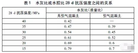 當無試驗資料可用時,對于含有Type1波特蘭水泥(硅酸鹽水泥)的混凝土,可以在表1中得到近似和相對固定的數(shù)據(jù)。用有代表性的材料,在試驗室標準養(yǎng)護條件下試驗28d的試塊,表1中的水膠比可以得到與之對應的強度。
