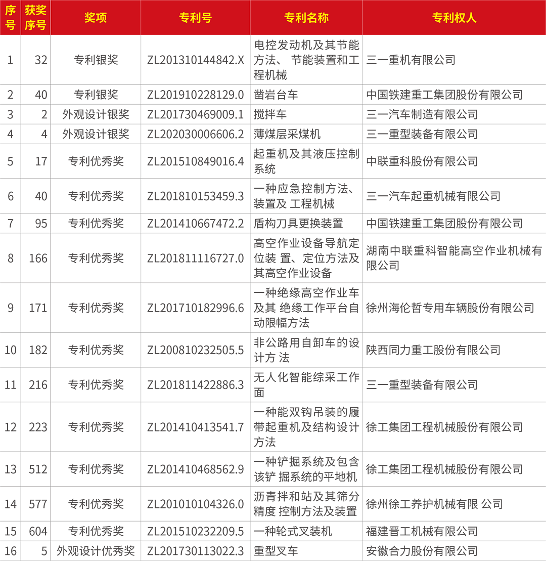 本屆評(píng)選活動(dòng)中,中國(guó)工程機(jī)械行業(yè)共有十六項(xiàng)專利榮獲“中國(guó)專利獎(jiǎng)”,其中兩項(xiàng)獲專利銀獎(jiǎng),兩項(xiàng)獲外觀設(shè)計(jì)銀獎(jiǎng),十一項(xiàng)獲專利優(yōu)秀獎(jiǎng),一項(xiàng)獲外觀設(shè)計(jì)優(yōu)秀獎(jiǎng)。