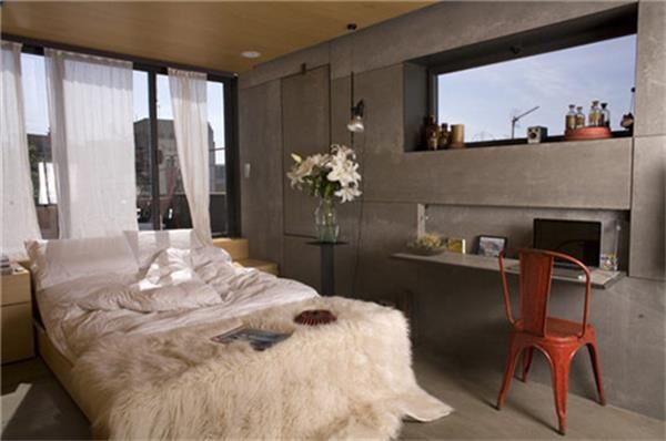 床的亮點(diǎn)設(shè)計(jì)在于它是可以伸縮的。白天可以推進(jìn)去,這里充當(dāng)飄窗的作用。墻面也是頗有創(chuàng)意和實(shí)用性,隱藏在墻上的混凝土板,拉下來變成方便的書桌或是餐桌。