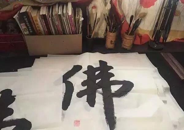 他家里有一個(gè)小書房,墻上掛滿了書法字畫,書架塞滿了書。家人說(shuō)他不用去工地的時(shí)候,就悶在書房里寫毛筆字。桌上摞著一疊裁好的方形宣紙,每張都寫有一個(gè)大大的“佛”字,左下角蓋著印章。