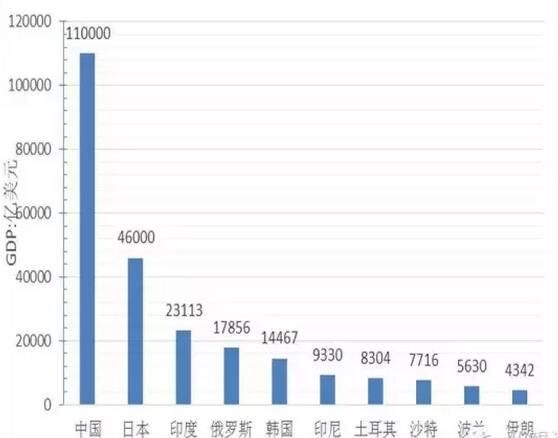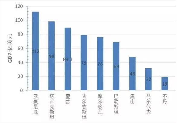 從經(jīng)濟(jì)總量看,GDP超過1萬(wàn)億美元的國(guó)家5個(gè),分別為中國(guó)、日本、印度、俄羅斯、韓國(guó),其中中國(guó)經(jīng)濟(jì)總量為11萬(wàn)億美元、位居第一、為最小國(guó)家不丹的5800倍,約占“一帶一路”地區(qū)經(jīng)濟(jì)總量的40%;GDP在5000億到1萬(wàn)美元的國(guó)家4個(gè),分別是印尼、土耳其、沙特、波蘭;GDP在1000億到5000億美元的國(guó)家19個(gè),GDP在100億到1000億美元的國(guó)家30個(gè);低于100億元美元的國(guó)家8個(gè),分別為塔吉克斯坦、蒙古、吉爾吉斯坦、摩爾多瓦、巴勒斯坦、黑山、馬爾代夫、不丹,其中經(jīng)濟(jì)規(guī)模最小為不丹、GDP為19億美元。