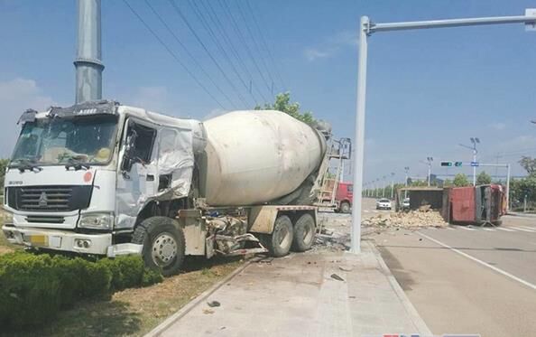 攪拌車闖紅燈撞翻大貨車