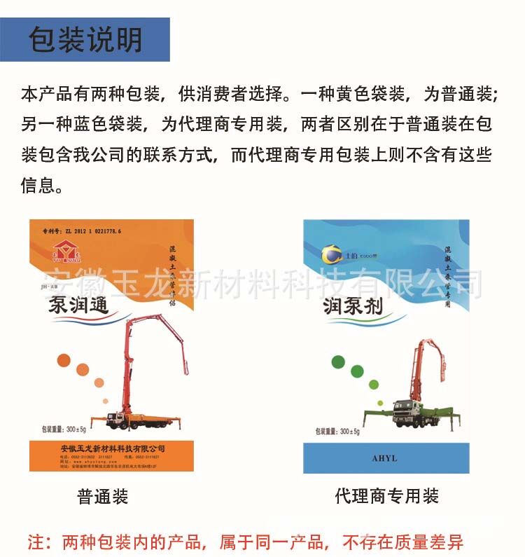泵車潤管劑(泵潤通)產品使用了可降解彩色復膜包裝,包裝規(guī)格:50袋/箱,300克/袋。本產品應儲存于防曬、通風、干燥處,保質期:三年。