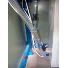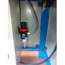 將膩子粉包裝袋套在出料嘴上,撥動彈簧開關(guān),壓袋氣缸開始工作并壓住袋口,控制器將包裝袋重量自動去除,通過空壓機的氣流經(jīng)三分管分成三路,其中一路去往進料口進行破拱,保證下料暢通。葉輪高速轉(zhuǎn)動迅速將物料撥出灌入袋中,隨袋中空氣一起溢出的粉塵經(jīng)排氣孔排出(對環(huán)保要求高的用戶也可連接吸塵器,由除塵器吸走)。待加料達到粗流設定值(L1)時,氣缸自動將橡膠軟管夾至1/2開口,出料速度減慢,到總設定(L2)時,氣缸將橡膠軟管完全夾死,出料停止,壓袋氣缸松開袋口,灌裝結(jié)束。