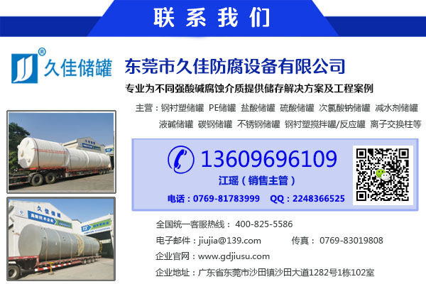 久佳防腐是一家專業(yè)生產(chǎn)100立方硝酸儲(chǔ)罐  久塑牌不銹鋼儲(chǔ)罐供應(yīng)  危廢 化成箔不銹鋼儲(chǔ)罐設(shè)備的知名品牌。久佳防腐旗下的儲(chǔ)罐設(shè)備適用于危廢處理、環(huán)保、化工、水處理、電子、電廠、能源等行業(yè)中酸堿鹽腐蝕介質(zhì)的儲(chǔ)存及中和反應(yīng),華南區(qū)大型鋼襯塑、PE、不銹鋼、碳鋼儲(chǔ)罐生產(chǎn)廠家。更多聚羧酸儲(chǔ)罐等介質(zhì)儲(chǔ)存容器資訊,請(qǐng)關(guān)注久佳防腐儲(chǔ)罐專注【酸堿鹽腐蝕性介質(zhì)】防腐容器設(shè)計(jì)方案。久佳防腐安全儲(chǔ)存25年載,精工產(chǎn)品、卓越品質(zhì)、服務(wù)完善、值得信賴!
