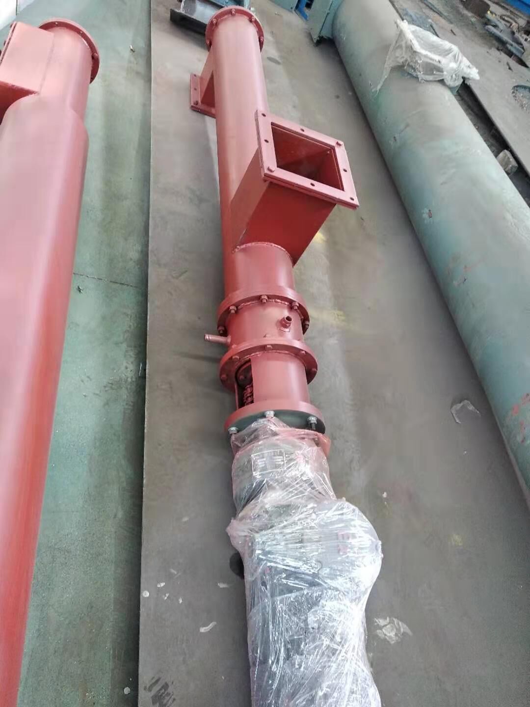 螺旋輸送機螺旋面的形式有實體螺旋(S制法)和帶式螺旋(D制法)兩種。各螺旋軸之間采用法蘭式聯(lián)接, 保證了聯(lián)接軸的互換性,便于維修。 螺旋輸送機機蓋為瓦片式并用蓋扣夾緊在機殼上,若需改進(jìn)密封性能,用戶可自行在機蓋與機殼間加防水粗帆布。 螺旋輸送機進(jìn),出料裝置有進(jìn)料口,方型出料口,手推式出料口,齒條式出料口四種,由用戶在使用現(xiàn)場在機體上開口焊接。布置螺旋輸送機進(jìn),出料口位置時應(yīng)注意保證料口至端部的距離,同時避免料口與吊軸承加油杯,機殼聯(lián)接法蘭,底座等相碰。