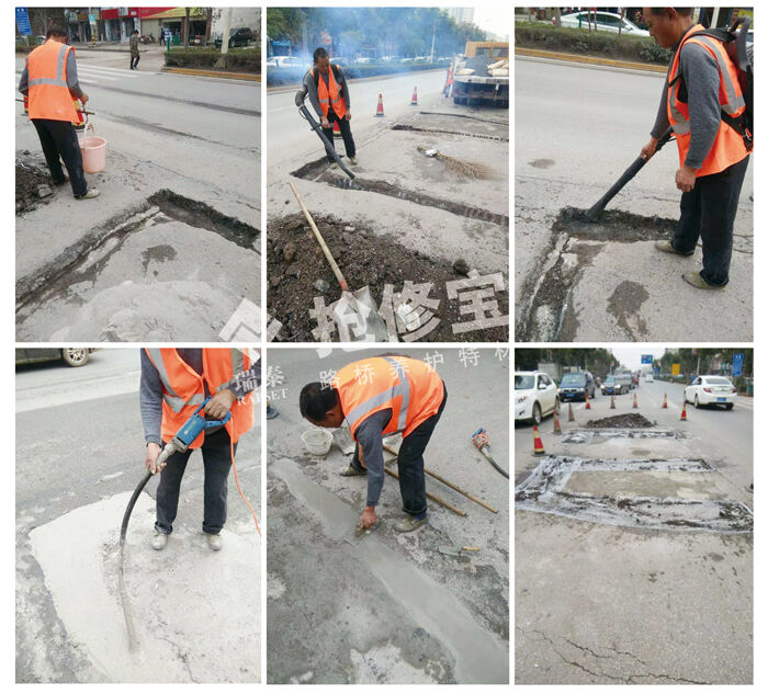 以使用搶修寶水泥路面修補(bǔ)料RT-2為例來(lái)說(shuō)明。使用搶修寶水泥混凝土路面修補(bǔ)料修補(bǔ)病害非常簡(jiǎn)單,首先在修補(bǔ)前,一定要對(duì)水泥混凝土路面坑槽進(jìn)行清理,然后再用高壓水槍沖刷干凈,沖刷后用風(fēng)槍將明水吹干,保持濕潤(rùn)狀態(tài);隨后根據(jù)坑槽的深淺,按施工比例充分?jǐn)嚢栊扪a(bǔ)料,攪拌后攤鋪于坑槽部位收光養(yǎng)護(hù)即可。搶修寶水泥路面修補(bǔ)料的粘結(jié)力表現(xiàn)、抗壓耐磨表現(xiàn)、無(wú)收縮無(wú)老化表現(xiàn)均良好,修補(bǔ)后材料不易脫落不易老化,使用壽命長(zhǎng),可以一次性修復(fù)水泥混凝土路面坑槽病害,恢復(fù)路面美觀及功能。