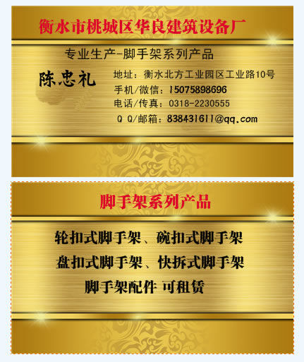 衡水水市桃城區(qū)華良建筑設(shè)備廠聯(lián)系電話:150-7589-8696。省力輪扣式腳手架具有拼拆迅速、省力,結(jié)構(gòu)簡單、穩(wěn)定可靠,通用性強,承載力大,安全高效,不易丟失,便于管理,易于運輸?shù)忍攸c。