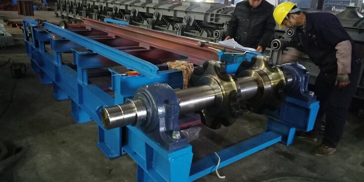 頭輪組裝有兩件主動鏈輪,與尾輪組相呼應(yīng),頭輪組做為主動輪組, 尾輪組為從動輪組。當(dāng)傳動機(jī)構(gòu)帶動頭輪轉(zhuǎn)動時,帶動輸送鏈條、刮板輸 送裝置運(yùn)轉(zhuǎn),完成輸送料過程。