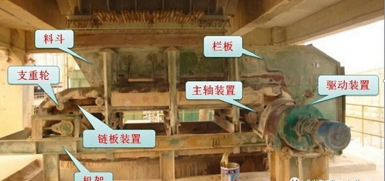 電機(或液壓馬達)的動力通過連軸器、減速機等部件驅動鏈輪轉動,鏈輪帶動輸送鏈條和鏈板一起向前運動,此時堆積在鏈板上的物料隨鏈板一起向前移動,在板式給料機的頭部卸下,實現(xiàn)連續(xù)給料。運轉時,輸送鏈的工作部分由上托輪支承,回程鏈板則有下托輪支承。