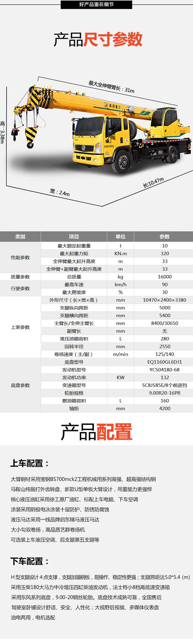 1、新型單板臂頭設(shè)計,全伸臂31米,最大吊高33米