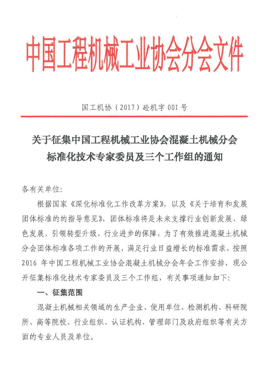 關(guān)于征集中國工程機(jī)械工業(yè)協(xié)會(huì)混凝土機(jī)械分會(huì)標(biāo)準(zhǔn)化技術(shù)專家委員及三個(gè)工作組的通知
