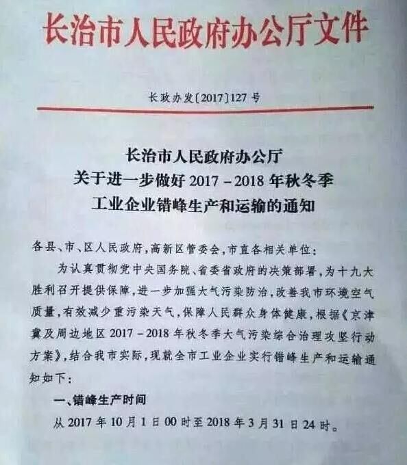山西省長治市也發(fā)布《關(guān)于進(jìn)一步做好2017-2018秋冬季工業(yè)企業(yè)錯峰生產(chǎn)和運輸?shù)耐ㄖ贰R笞?017年10月1日00時起至2018年3月31日24時,水泥(含粉磨站)等建材行業(yè)企業(yè)全部停產(chǎn)。