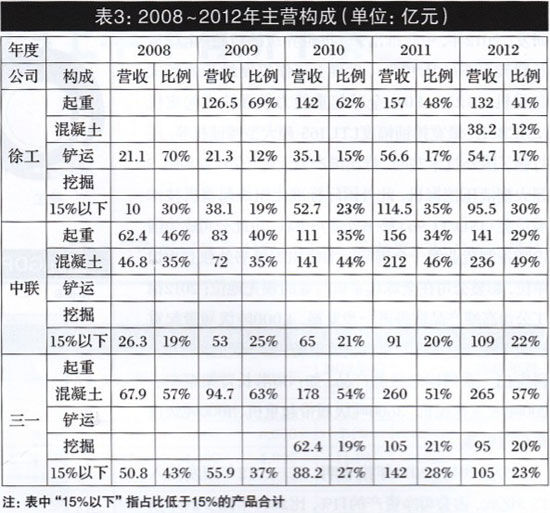 圖4 2008~2012年徐工、中聯(lián)、三一年度主營構(gòu)成圖