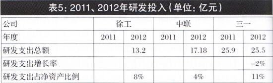 分析2011、2012年報表明,三一2012年研發(fā)投入25.5億元,占公司凈資產(chǎn)的11%,比2011年減少2%,研發(fā)投入出現(xiàn)下降趨勢;2012年,徐工研發(fā)投入13.2億元,占凈資產(chǎn)的8%;中聯(lián)研發(fā)投入17.18億,占凈資產(chǎn)的4%;徐工、中聯(lián)研發(fā)投入和占比,均低于三一(見表5)。由此可知,在打造公司核心競爭力,提升公司價值方面,三駕馬車研發(fā)投入的趨勢和占比均存在提升的空間。