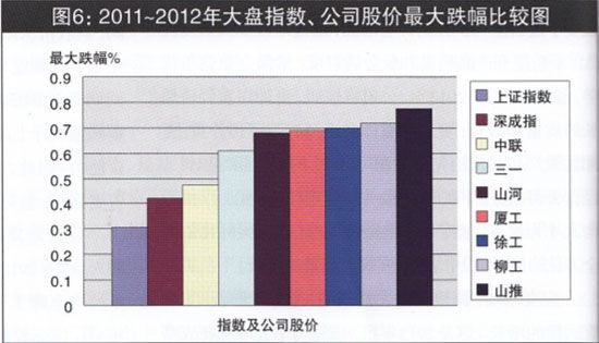 2011年,行業(yè)遭遇寒冬,三駕馬車營業(yè)收入合計增三率與宏觀經(jīng)濟指標(biāo)對比,呈加速度下跌態(tài)勢,而且在資本市場的表現(xiàn)弱于滬深大盤指數(shù)。2011年~2012年間,其股價從最高點至最低點,下跌47.3%、61.2%、69.8%不等;而同期上證指數(shù)下跌幅度只有30.67%,深成指下跌42.1%。盡管與行業(yè)內(nèi)其他上市公司同期資本市場表現(xiàn)相比,工程機械行業(yè)三駕馬車的表現(xiàn)仍有亮點,但其同期跌幅大于上證和深成指跌幅,仍然令公司形象受損,影響資本市場再融資能力。因此,打造公司核心競爭力,提升公司投資價值,提振資本市場投資者信心,至關(guān)重要(大盤指數(shù)、公司股價最大跌幅比較圖,見圖6)。