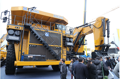 徐工在bauma2014上展出XDE240大型電傳動(dòng)礦用自卸車(chē),該車(chē)載重量230t,額定功率2500hp,發(fā)動(dòng)機(jī)配置MTU16v4000,發(fā)電機(jī)采用GE GTA-41,牽引電機(jī)采用GE B25,輪邊減速比為31.8:1,采用交—直—交電傳動(dòng)技術(shù)